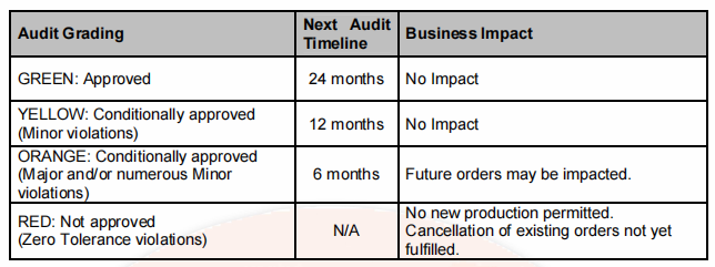 基于 “交通灯” 分级体系,工厂审核结果分为四个等级。各等级对应的后续审核安排及对生产的影响,详见下表(注:原文提及的 “下表” 未提供,此处保留原文逻辑)。
