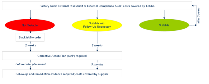 TCHIBO对SCoC的实施在审核中进行定期的审查。每次的审核通常需要一天时间而且要由两名审核员进行。通常来说,这些审核会提前2周进行通知。然而,我们保留会随时进行突击审核的权利。审核分以下两种: