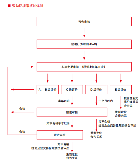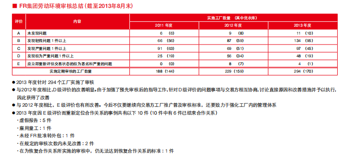 审核的结果,按照 FR 的标准(A ~ E)进行评价,性质极为恶劣的事例为 E 级评价,会立即决定重新定位合作关系。针对 C 级与 D级评价进行改善指导,实施跟进审核来确认改善结果,如未有改善再提交企业交易伦理委员会审议,做出重新定位合作关系等决定,可以看出迅销对于审核的态度极为严格。另外如发生严重事态,CSR 部员工将直接前往该工厂,确认事实关系后重新审视合作内容,并根据工厂的经营和雇用情况作出最终决定。然后与工厂一起采取措施防止复发,如果工厂能够加以改善,也会进行重新定位,恢复正常合作关系。
