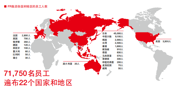 FR 集团的事业舞台面向全球,但支撑整个集团发展的中枢机构则是位于东京的总部。集团员工约有 72,000 名,其中在日本工作的员工约为 45,000 名。今后我们将对东京总部进行改组,将其打造成为具有多样性的最佳团队,从而真正成为领导 FR 集团发展的全球司令部(总部)。