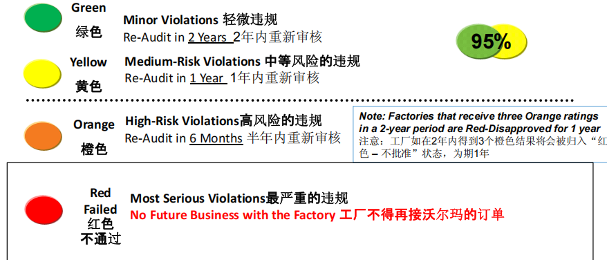 WAL-MART验厂咨询-沃尔玛审核结果呈现:采用颜色代码评级方式,直观体现审核达标情况