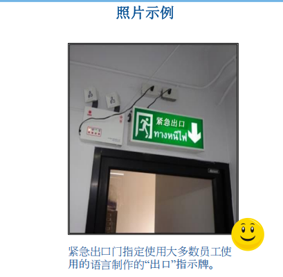 2. 索取一份设施使用的主要语言列表,以及估计每种语言的员工比例。对比紧急“出口”指示牌上的语言和报告的语言;和