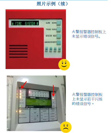 5. 要求查看火警报警器控制面板,并评估火警报警系统的连接或功能可能发生故障的任何错误信号。