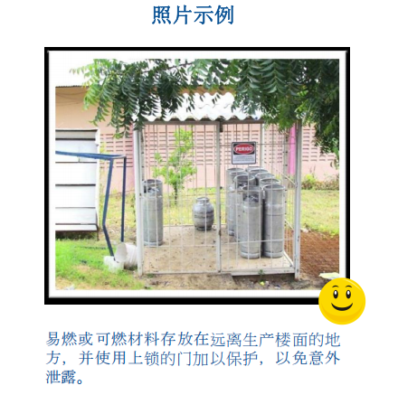 1. 设施走访期间,观测生产楼层是否存放有标记或被确定为可燃材料的存储容器;和