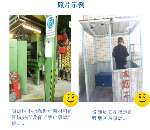 WAL-MART验厂咨询-吸烟管理违规判定:非指定区、可燃材料区吸烟及吸烟区无防护列为违规