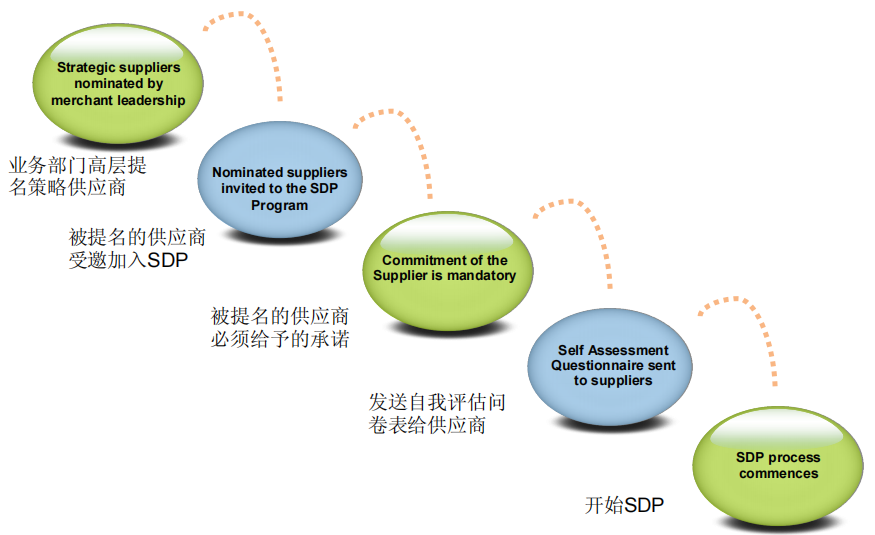 各零售市场和全球采办的团队共同提名参与该项目的供应商。在各零售市场中,由资深买手负责鉴别、提名并挑选合适的供应商参与SDP