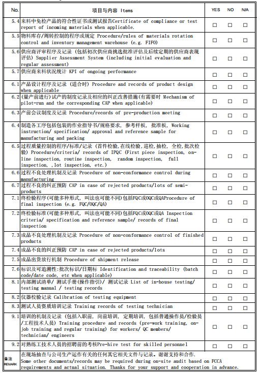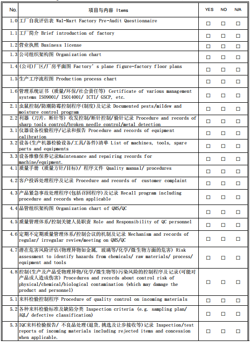 WAL-MART工厂产能能力(质量管理)审核文件清单