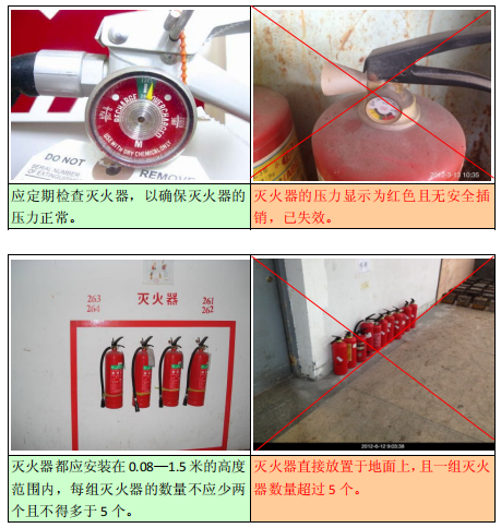 灭火器必须安装在墙壁上或设置在与眼睛平视的位置(0.08米—1.5 米)。必须采用高度可见的油漆和带本地语言的灭火器标识指出灭火器的位置。必须保持灭火器畅通无阻。