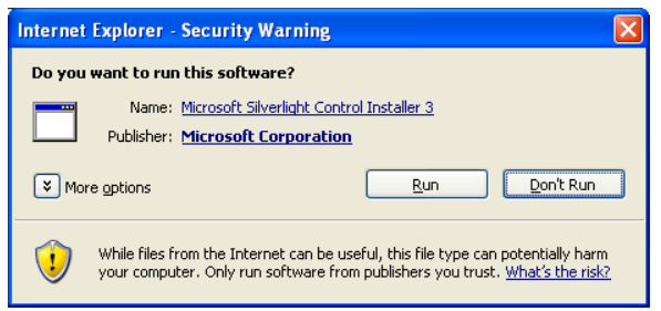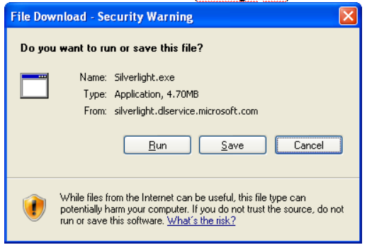 4、点击该图标即可启动 Silverlight 安装流程,浏览器会提示您选择 “运行” 或 “保存” 安装文件(文件名为 Silverlight.exe)。