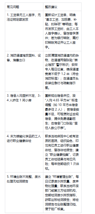 结合服装工厂的普遍情况,WARNACO 验厂中最易出现的问题集中在 “劳工权益” 与 “健康安全”,以下为针对性整改建议: