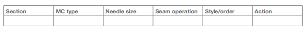 该报告为表格形式,需包含以下列项:区域、机器类型、针具尺寸、缝纫工序、款式 / 订单号、处理措施;