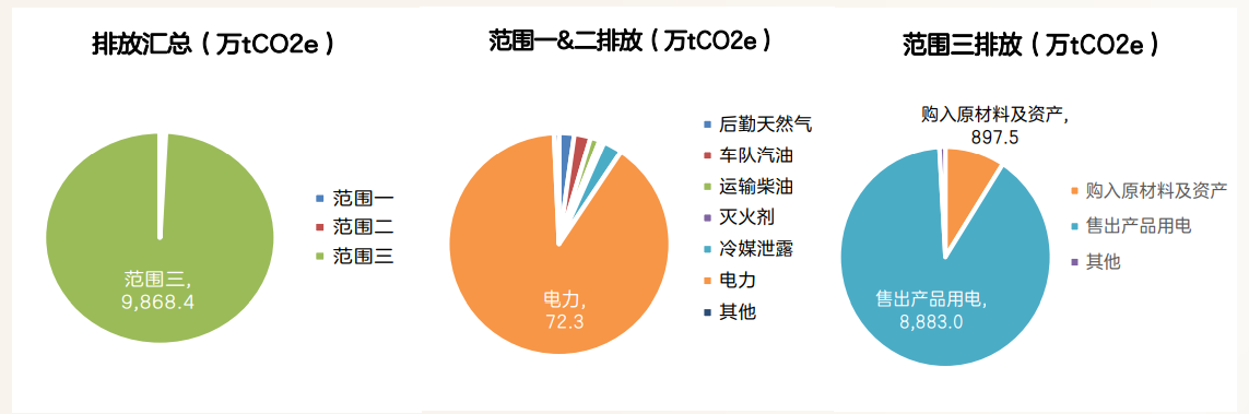 中兴通讯的排放分布规律体现出了 ICT 高端制造企业的特点。企业自身运营产生的范围一、二排放占比相对比较小(占比约 1%),而且以用电产生的范围二排放为主;绝大部分排放属于范围三排放,产生于上下游价值链(占比约99%),最突出的构成是售出产品使用排放(占比接近 90%)、购买货物及服务的排放(占比接近 9%)。排放的分布特点预示着中兴通讯不仅需要致力于自身运营减排,更要注重于上下游伙伴之间协同来共同减少价值链排放。