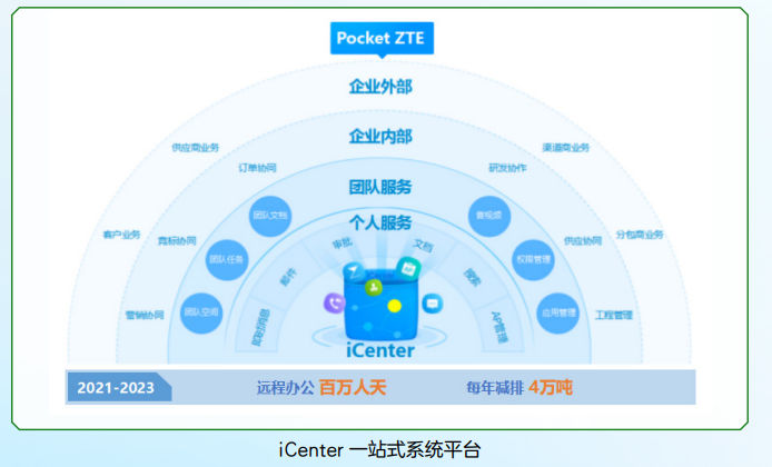 中兴通讯自研的一站式协同平台 iCenter,实现人与人、人与知识、人与业务、人与设备的在线全连接。它让员工可以全面线上互动,减少线下的人员、物品流动。通过云桌面、消息、空间、音视频会议等设备和应用支撑,可支持常态化远程办公,替代传统的现场会议、市内外差旅等高碳足迹办公模式,2023 年避免的航空、高铁旅程碳排放高达 67 万吨。该产品也通过了信通院首批智慧办公数字化服务认证。