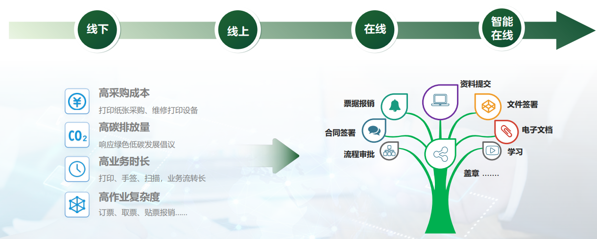 中兴通讯基于“线下 -> 线上 -> 在线 -> 智能在线”的数智化演进逻辑,梳理线下信息流动场景,通过一体化文控打印控制线下流动、线上化的场景工具支撑的堵疏结合策略,全面降低纸张消耗和人员流动导致的碳排放。 在日常工作中的通知公告、资料提交、电子文档、文件签署、流程审批、合同签署、票据报销、学习、考试、盖章等高频场景中,都已向员工提供了方便易用的数智化工具,在改善员工满意度的同时,有效减少使用纸张的必要性。