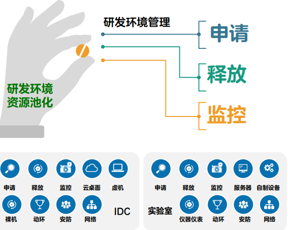 建立用户视角的研发环境可视、可申请 / 释放的应用场景 ; 建立管理视角的研发资源线上、可编排、可管理、可监控的运营场景,实现研发资源共享,减少研发资源配置需求。