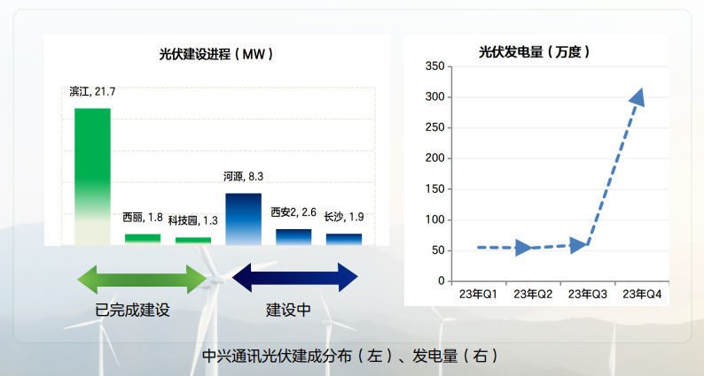 解绑化石能源依赖,是实现“双碳”目标的必经之路。近年来,中兴通讯持续在园区运营中加大清洁能源使用占比,积极开展新能源项目,先后在深圳、河源、南京、西安、长沙等城市规划建设光伏电站。截至 2023 年底,光伏装机量累计达 24.8MW;预计于 24 年底完成全部园区光伏建设,装机量达到 37.6MW,近 2 年累计增长 12 倍。 2023 年,中兴通讯自建光伏电站累计发电 484.7 万度,其中 Q1 至 Q3 累计发电 169.1 万度,Q4 滨江光伏项目竣工,自建光伏发电 315.7 万度,环比增长近 4.3倍。
