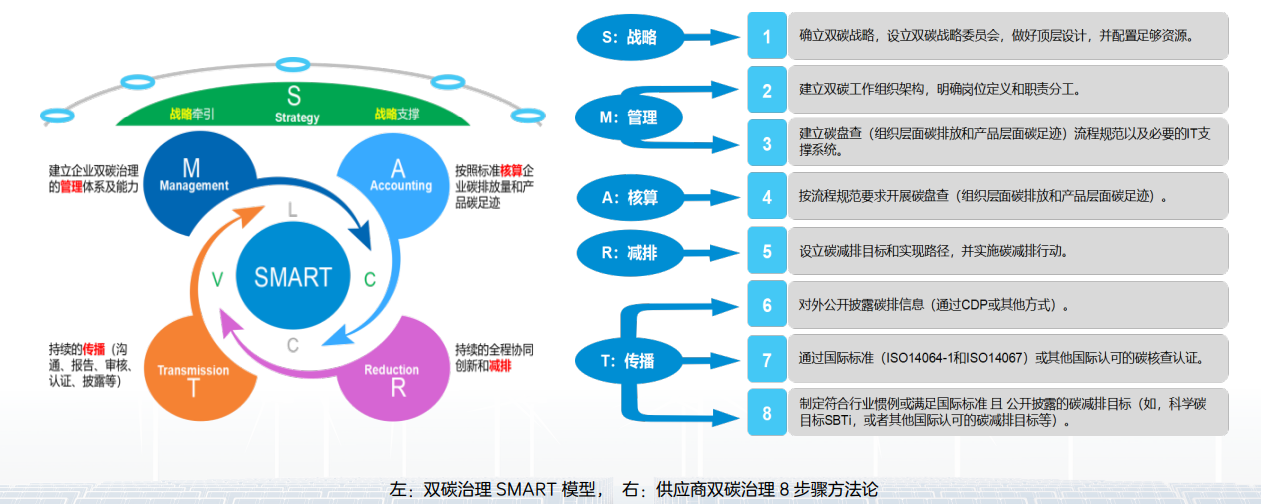 中兴通讯从战略(Strategy)、管理(Management)、核算(Accounting)、减排(Reduction)和传播(Transmission)五大维度出发,自主开发了“双碳治理 SMART 模型”,作为低碳采购的基本方法论,并在此基础上又进一步提炼出“供应商双碳治理八步骤方法论”,指导供应商有效开展双碳治理工作,该模型荣获了中国物流与采购联合会 2023 年度科技进步奖。