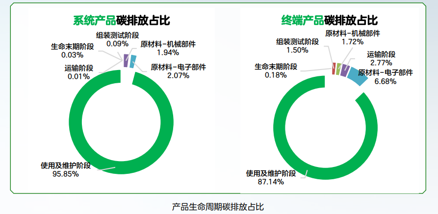 公司自 2021 年起建立了产品全生命周期评估(LCA)能力,引入国际认可度较高的 GaBi 评估软件及其数据库,严格按照 ISO 14040 环境管理生命周期评估原则与框架、ISO 14044 环境管理生命周期评估要求与导则、ISO 14067 针对产品层面温室气体核查等国际标准,成立专家团队对公司所有产品类别开展碳足迹评估。截至 2023 年底,公司开展过碳足迹评估的产品数量超过 100 款,覆盖公司所有产品类别。 在标准流程方面,中兴通讯关注产品全生命周期碳排放指标,编制《产品降耗技术要求》《终端产品减碳技术要求》《中兴通讯产品 LCA 碳足迹评价规范》等规范制度,并将 LCA 要求嵌入研发流程,新增产品生命末期阶段评估方法和产品 LCA 碳足迹评估资料清单,从源头推进产品减碳设计。 中兴通讯产品种类众多,根据产品实现的功能可分为如下类别:无线产品、有线产品、数字能源产品以及终端产品。通过对公司各类别产品全生命周期碳排放占比进行分析,产品在使用及维护阶段因用电导致的碳排放量一般高于 85% 甚至 95%,因此提高能效是产品降碳工作的绝对重心。