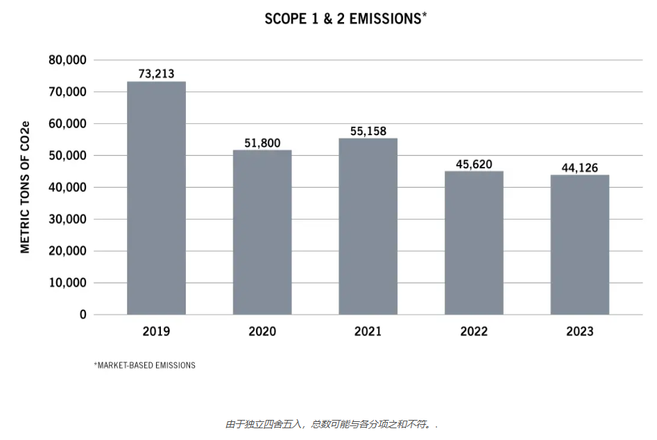 范围1和2温室气体(“GHG”)排放包括固定燃烧、移动燃烧、逸散性排放和外购电力。我们通过安装LED照明和分项计量系统等策略,提升全球总部、数据中心及门店的运营效率,从而减少范围1和2排放。