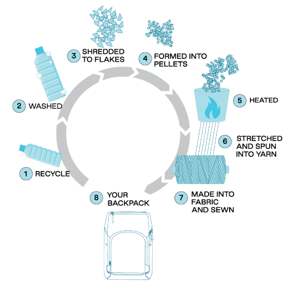 自 2022 年起,我们开始逐步在产品中采用再生聚酯(rPET)。我们倍感自豪的是,从 2024 年起,我们所有书包的主要材料均为来自塑料瓶的再生聚酯。